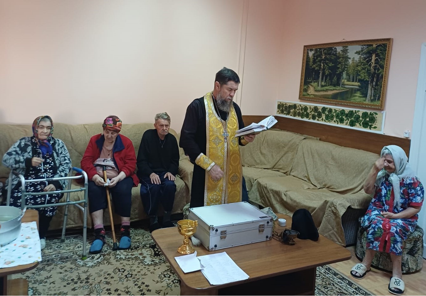 В Социально-реабилитационное отделение пригласили настоятеля храма — иерея Константина Алексеевича Бондаря. Присутствующие прослушали урок православной культуры «Введение во храм Пресвятой Богородицы». Для немобильных получателей социальных услуг отец Константин провел службу, а также таинства исповедания и причащения.