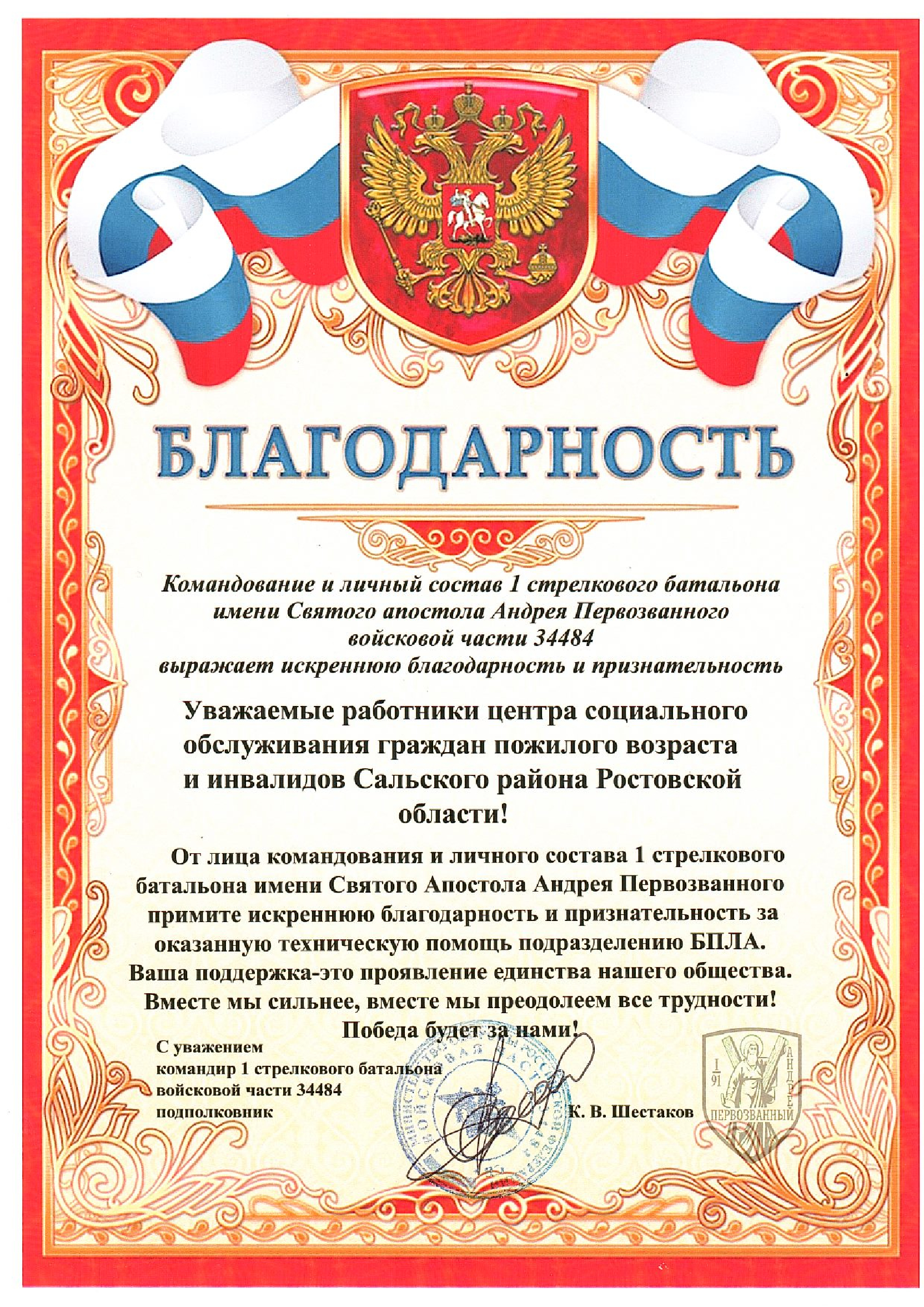 Коллективу МБУ «ЦСОГПВиИ Сальского района» в торжественной обстановке были вручены Благодарность от Командования и личного состава 1 стрелкового батальона имени Святого апостола Андрея Первозванного войсковой части 34484 и Благодарственное письмо от личного состава 1 мотострелкового батальона 103 мотострелкового полка 150 мотострелковой дивизии 8 общевойсковой армии за оказанную гуманитарную помощь и моральную поддержку в условиях проведения специальной военной операции на территориях Донецкой и Луганской Народных республик.